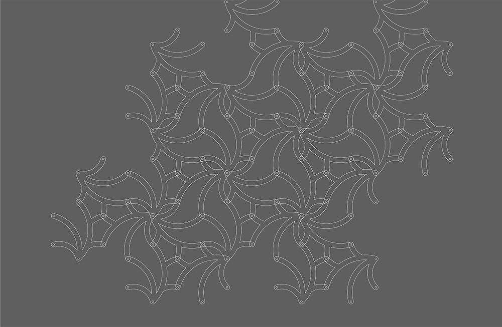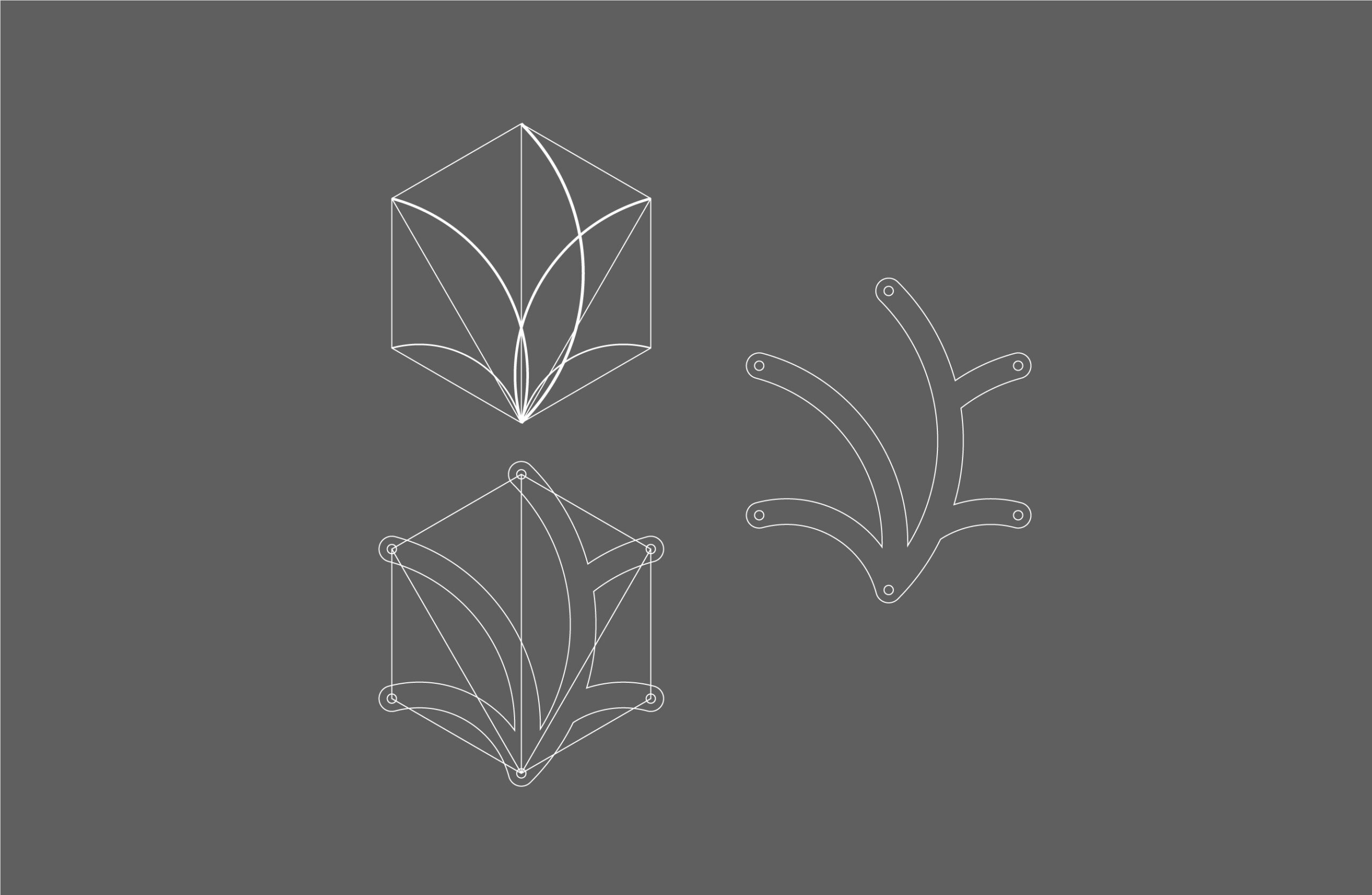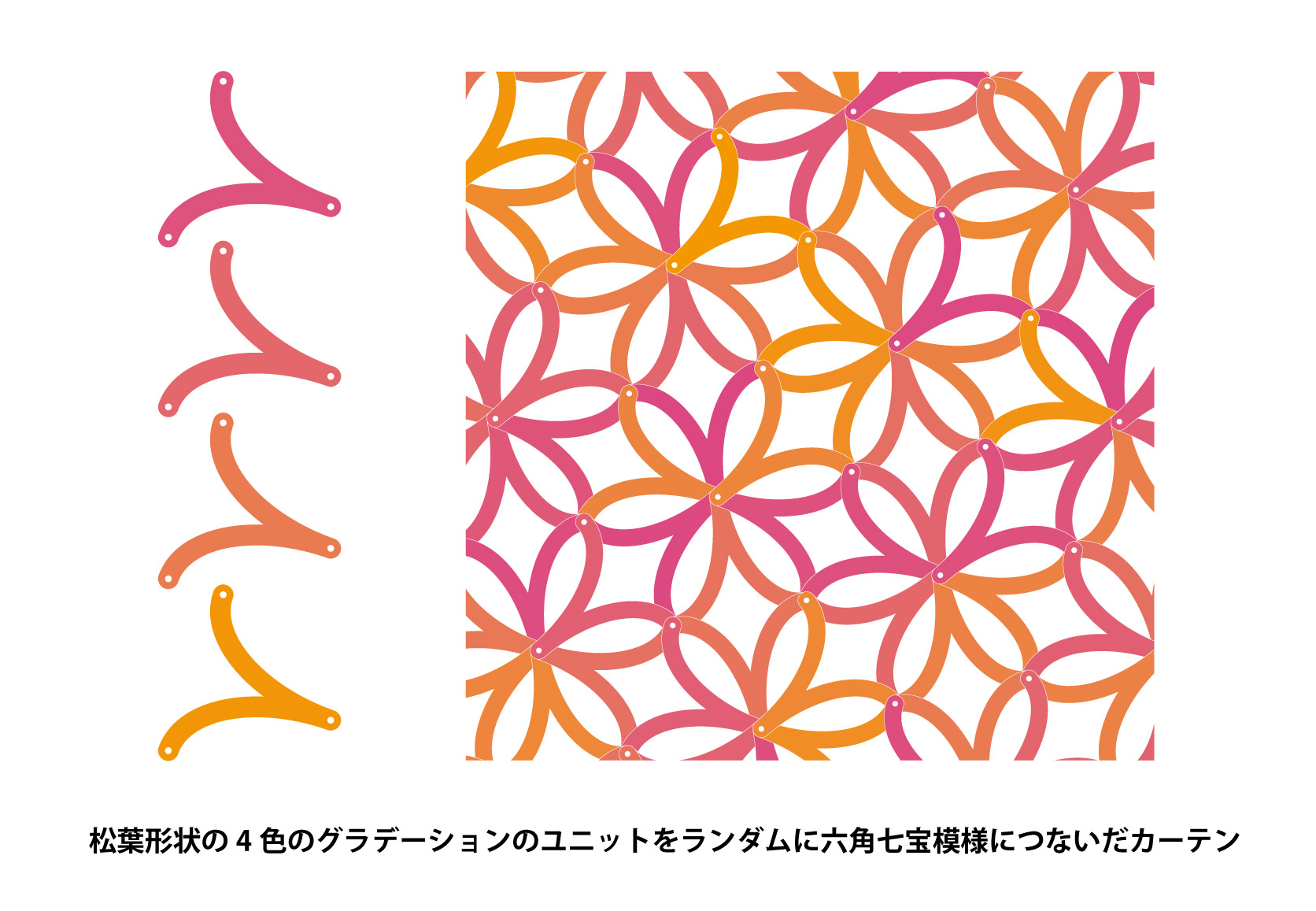 6角形や3角形の頂点同士をつなぐユニット。頂点はそのままにしてほかの部分の形を変化させることで、ユニットをつないだ時に不思議な見え方をします。置き方をランダムにする以外にも、色をランダムにするのも面白くなりました。出来上がったユニットはシェードなどに利用が可能です。作業療法の構造体のデザインとして考えました。