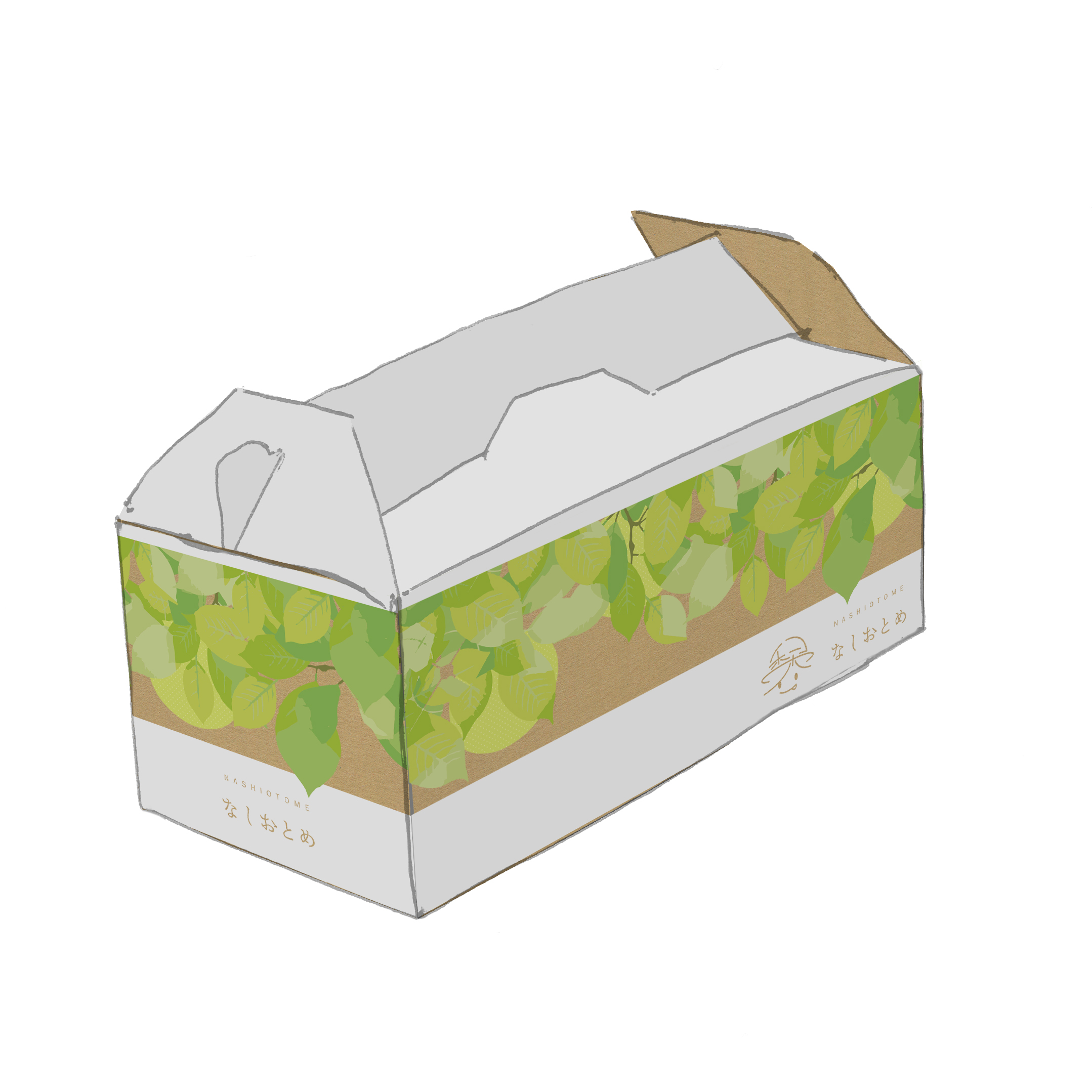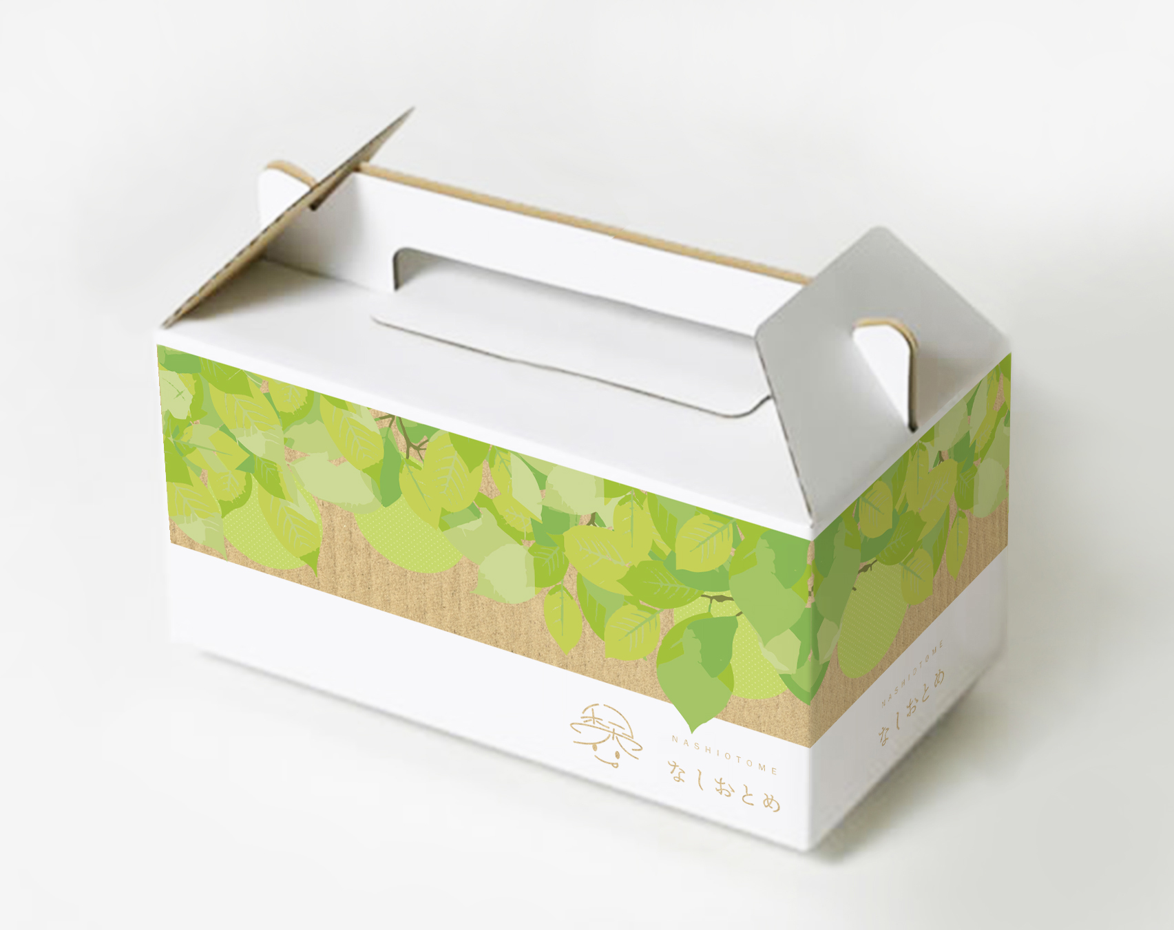 品種改良によって生まれた新種の梨。PRのため、ロゴとパッケージの制作依頼がありました。みずみずしい歯ごたえと爽やかな香り、美しい緑色が特徴の梨だったため、「なしおとめ」という名称がつけられました。みずみずしさのイメージとして葉と梨を周囲にあしらったデザインにし、段ボールの地の色を活かし、オーガニック感を演出しています。