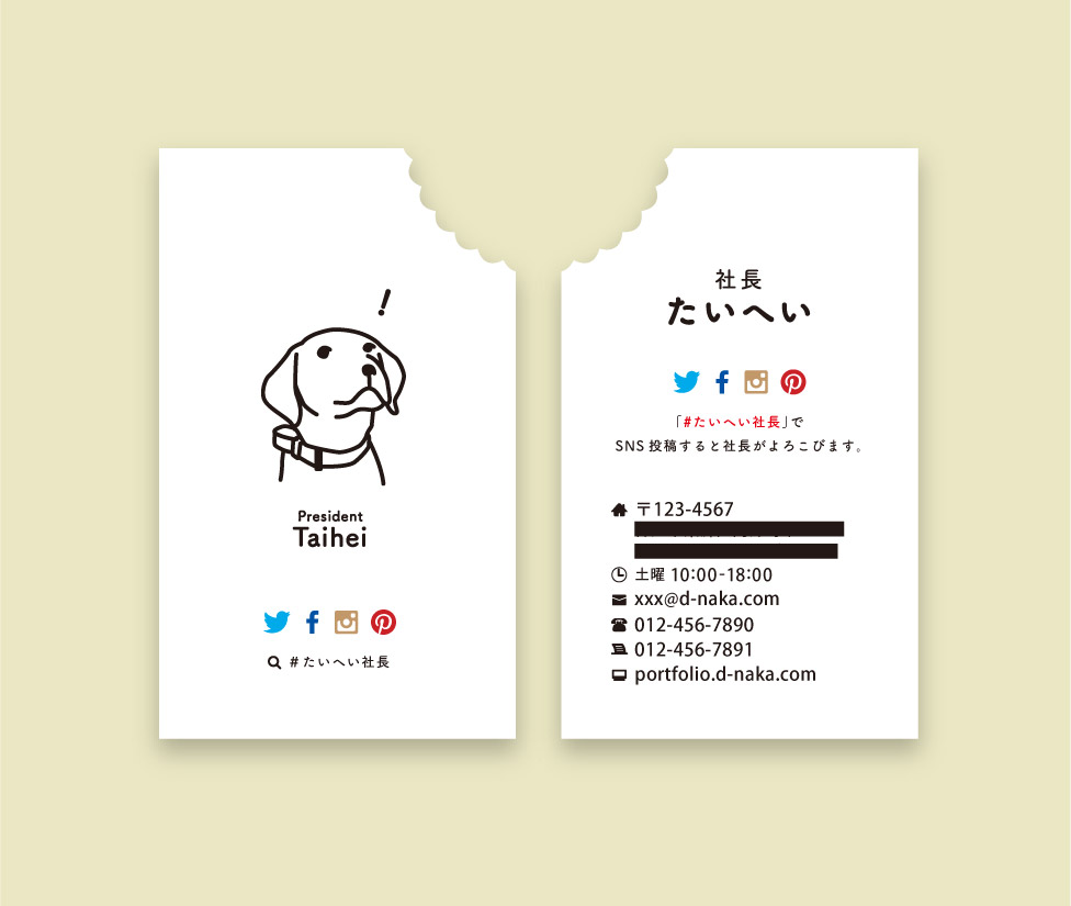 ドッグカフェの犬店長の名刺を作成しました。噛み跡を可愛く見せるためにその他の要素はミニマルな雰囲気に作成。少しおもちゃ感のあるようなアイコンやフォント選びをしてレイアウトしています。